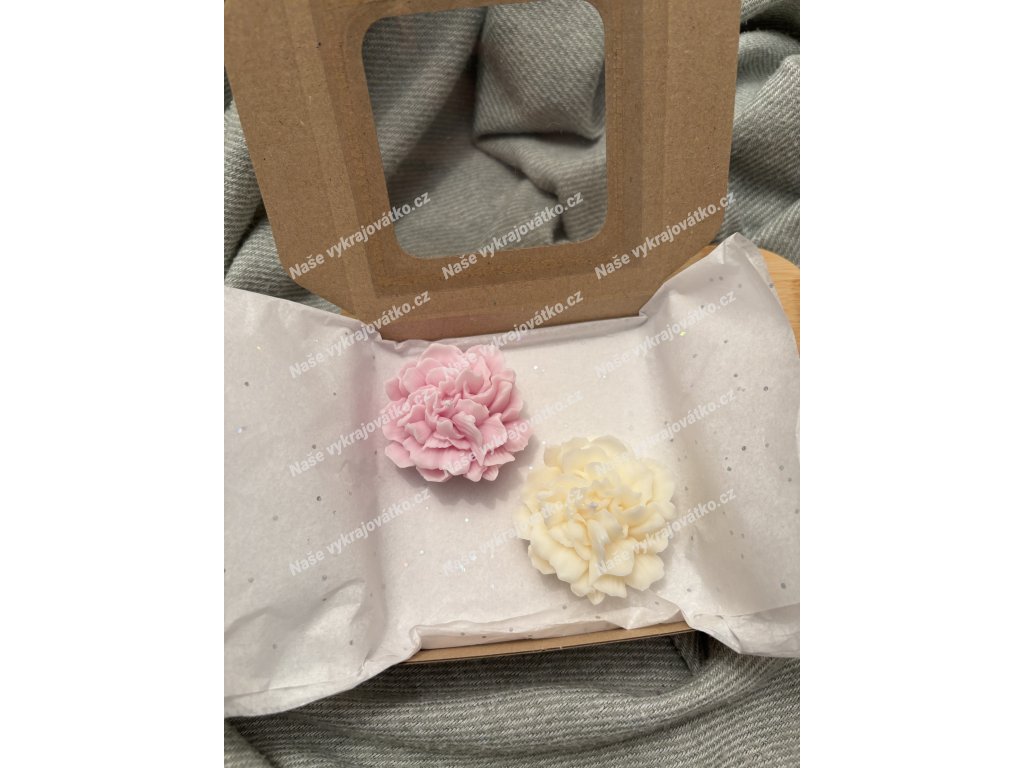V krabičce najdete 2 ručně odlévané svíčky ve tvaru květin